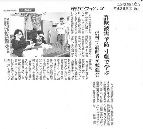 新聞掲載・報道情報 新着一覧 [10/21掲載]信濃毎日新聞 シルバーカフェでは、福島の子に木の実を送る活動を応援しております。その活動が2014年10月21日の「信濃毎日新聞」に掲載されました。 2014年10月23日 新聞掲載・報道情報 [10/16掲載]タウン情報 シルバーカフェの活動が2014年10月16日の「タウン情報」に掲載頂きました。 2014年10月17日 新聞掲載・報道情報 [8/28掲載]市民タイムス シルバーカフェの活動が2014年8月28日の「市民タイムス」に掲載されました。 2014年9月2日 新聞掲載・報道情報 [4/5掲載]読売新聞 シルバーカフェの活動が2014年4月5日の「読売新聞」に掲載されました。 2014年4月5日 新聞掲載・報道情報 [2/8掲載]中日新聞 シルバーカフェの活動が2014年2月8日の「中日新聞」に掲載されました。 2014年2月12日 新聞掲載・報道情報
